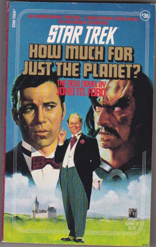 And now to sink for all time my reputation as a serious literary intellect. In my college days I couldn’t get enough of Star Trek–specifically Star Trek novels, and Penguin Books was cooperating by pumping out a title or three per quarter. Needless to say, quality varied, and “good” can certainly be a matter of taste. Only one of these titles has stayed in my library through all my subsequent moves. I speak of How Much For Just The Planet, by John M. Ford.