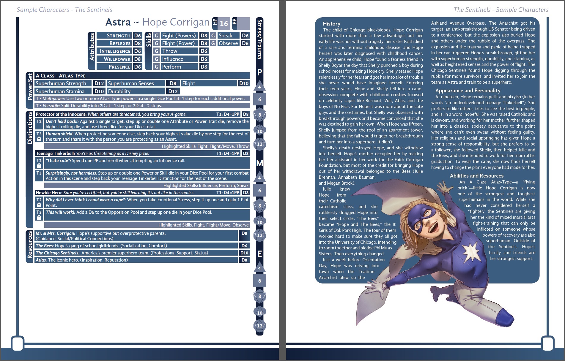 Astra Character SheetHello, all faithful and impatient readers! Nothing new to say about Small Town Heroes, other than it is coming along and I’m feeling very good about it (anything more would be spoilers). Still looking at a late-summer release date. Right now, I thought I’d take a quick break from writing to show everyone some of the fruits of the beta playtests of Wearing the Cape: The RPG.
