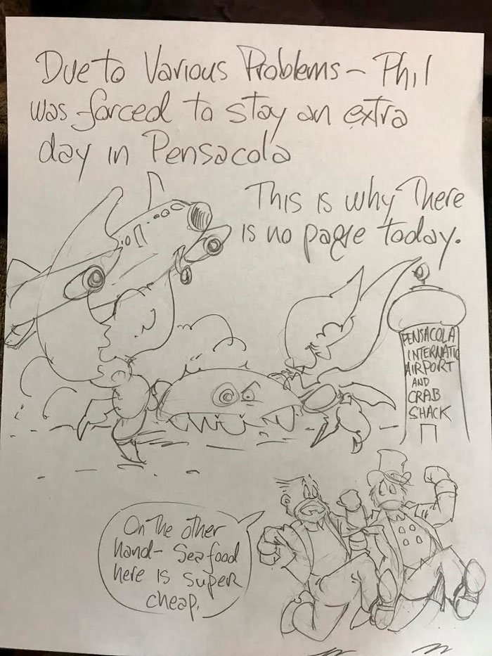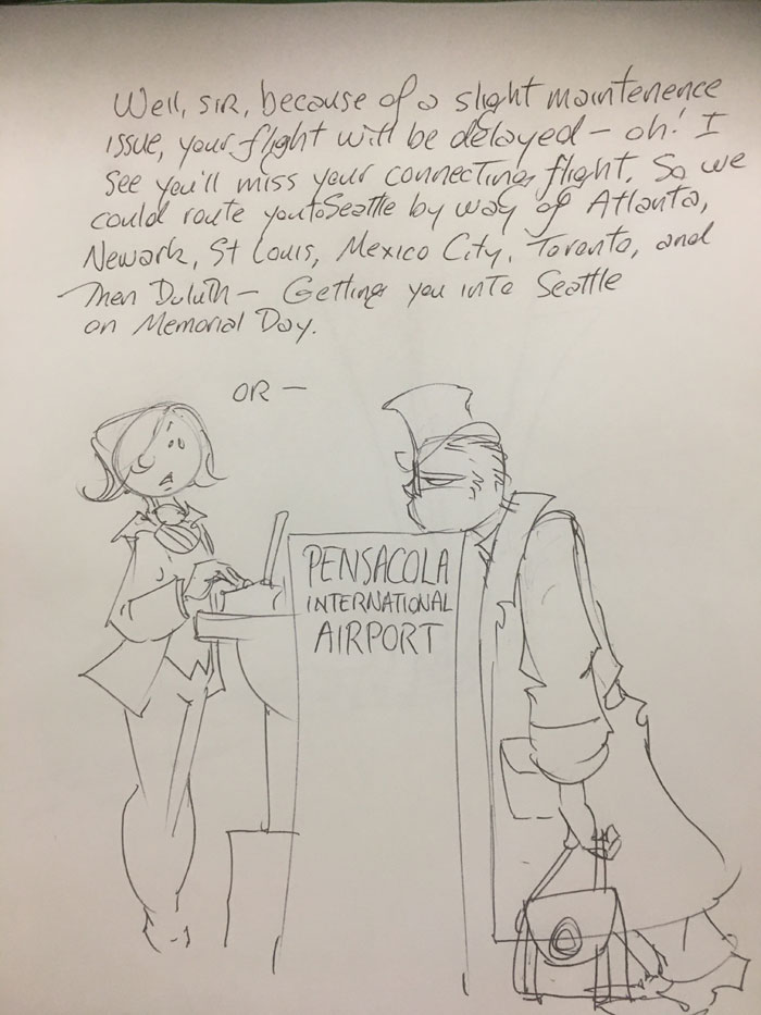 I’ve been to several cons, now, and my experience as a con guest has been varied, but I can absolutely say that Connecticon (Hartford) and Pensacon both treated us authors like VIPs. At Pensacon I shared the booth with some great authors. You can see Jodi Lynn Nye and Phil Foglio up there. Jim Butcher was there, but didn’t make it into the shot. I will happily return to Pensacola. Phil and I became con-buddies; mostly because we were both interested in checking out the local food (we discovered an amazing hole-in-the-wall pasta place better than a 4-star restaurant). Both of us were scheduled to fly out the next day on the flight to Dallas. We went to check out the beach (one week pre-Spring Break) and dip our feet in the Gulf, ignored each other like two cats while we hung out in the hotel lobby doing our own creative thing before heading to the airport. Phil’s described what happened next. As eloquently as only an artist can.