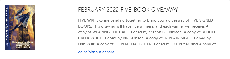 http://davidjohnbutler.com/giveaways/february-2022-five-book-giveaway-2/?fbclid=IwAR0MjUhWhSzAlekQ5SqH_A2t1mL6pgY0kSJBIgnJ72Dbfp4R__hDT1IdZRk